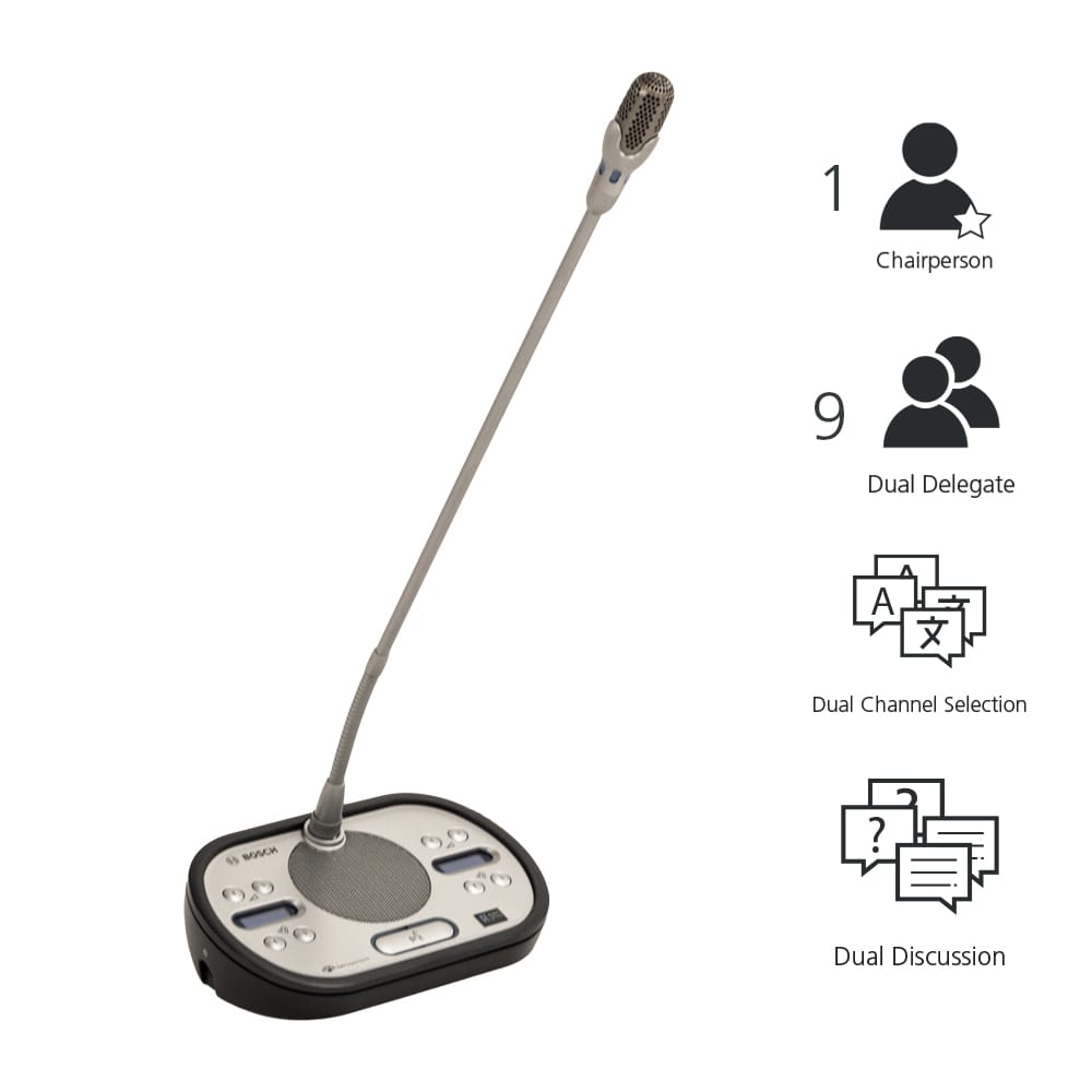 Un ensemble de 10 unités de discussion DCN-DISDCS-D de Bosch, chacune équipée d’un long microphone enfichable DCN-MICL de Bosch (480 mm). Conçu pour une communication claire et efficace, ce système est idéal pour les conférences, les salles de conférence et les événements multilingues où un son de haute qualité et un positionnement flexible sont essentiels.